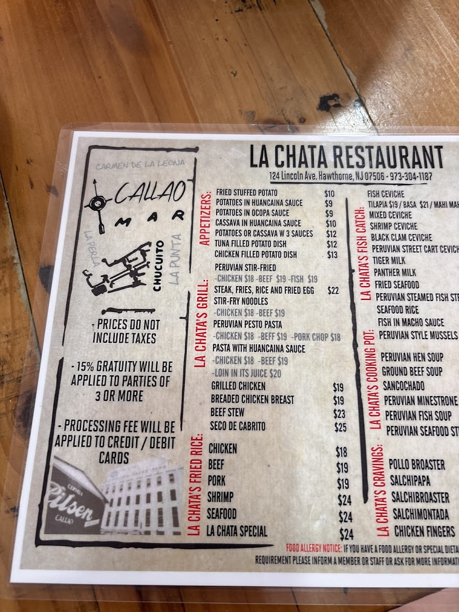Welcome to La Chata Restaurant, a delightful gem nestled in Hawthorne, NJ. Renowned for its authentic Peruvian cuisine, La Chata offers a vibrant menu that showcases the rich flavors of Peru. From the refreshing Fish Ceviche to the delectable Lomo Saltado, every dish is crafted with care and passion. Seafood lovers will revel in the diverse options, including Mixed Ceviche and Fried Seafood, while those seeking traditional comforts can indulge in Pasta with Peruvian Pesto or hearty Arroz con Mariscos.